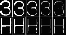 细化过程采用的是FPA细化算法【1】,其实现简单,功能强大,效果理想。如图3所示,即为对图像中两个已分离字符的细化过程。